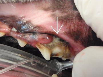 Crowding of teeth enhances tartar formation, and 70 % of tartar is bacteria. The white arrow shows prolific tartar on these teeth. Because these two teeth commonly develop gum recession and jaw bone recession, roots are exposed and infection develops.
